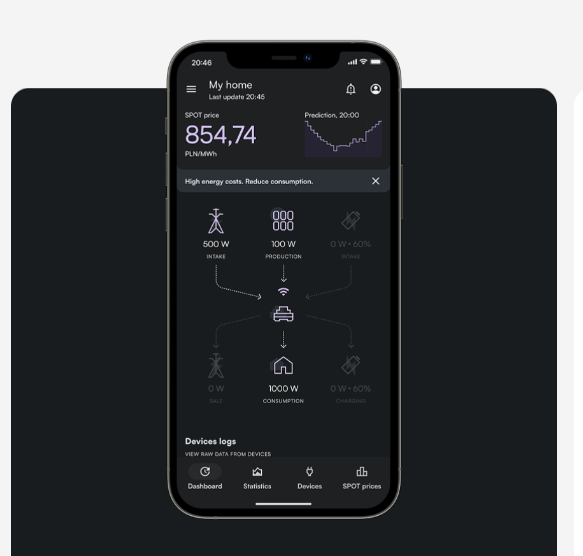 Valdykite energijos kaupimą pagal dinaminį tarifą. Prijunkite įrenginį prie instaliacijos. Prijungus įrenginį tiesiogiai prie hibridinio keitiklio, užtikrinamas energijos kaupimo valdymas ir gamybos bei vartojimo duomenų rinkimas. Programėlė automatiškai valdo energijos kaupimą, optimizuoja energijos sąnaudas ir pateikia įžvalgų apie dabartinę būseną. Platformos dėka turėsite prieigą prie įspėjimų, realaus laiko gamybos ir vartojimo duomenų. Elektros energijos sąskaita bus mažesnė dėl pateikiamų rekomendacijų ir išmanaus elektros energijos valdymo.